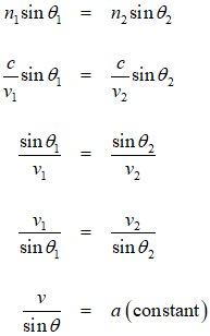 Snells Law: n1sinθ1 = n2sinθ2 where ni = c/vi (the index of refraction in medium i), c is the speed of light in a vacuum, and vi is the speed of light in medium i. The connection between Fermats Principle and Snells Law is explained here: Fermat