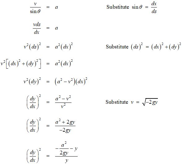Loose EndsI am not going to do all of the clean-up work, but I will point out some remaining problems and leave them as exercises, beginning with the hardest one. This part is a bit disconcerting. I have seen several explanations of the brachistochrone in textbooks and on the Web. Undoubtedly, this issue has been addressed before, but I have not seen it. All of the treatments I have read arrive at some form of this differential equation: