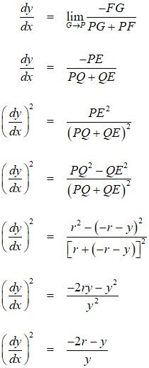 For comparison, we would like to find the square of the derivative of a cycloid. Let P be the point on the rolling circle that is tracing the cycloid. Let r be the radius of the circle, Q the center, and D the point of tangency between the circle and the x-axis. The x-coordinate of P can be expressed as