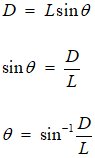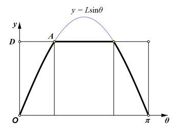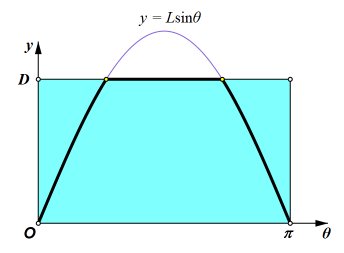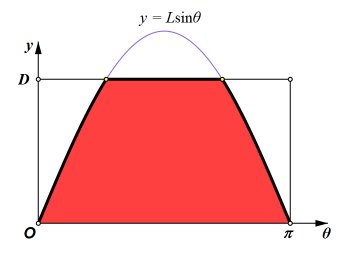 What if D < L?My presentation of Buffons Needle was placed on the web in 1997. Since then, several visitors asked for a derivation of the formula for the case in which D < L. It follows the same line of reasoning as the other case. The outcome of a trial may be modeled with θ-y coordinates of a point. All possible outcomes fall within the rectangle shown here, with 0 < θ ≤ π and 0 < y ≤ D. If the point falls beneath the curve y = Lsinθ, then the outcome is a success. This time, we cannot simply use the area of the region beneath the curve, because, when D < L, not all of the curve is on the rectangles interior. We need the area of the region that is both beneath the curve and within the rectangle. In the second drawing, that region is divided into three parts.