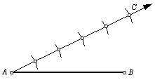 2. Draw a ray from point A. Use the compass to step off five uniformly spaced points along the ray. Label the last point C. |