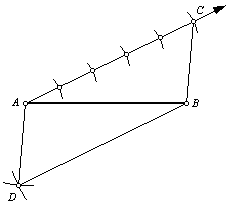 3. Draw an arc with the compass centered at point A, with radius BC. Draw a second arc with the compass centered at point B, with radius AC. Label the intersection point D. Note that ACBD is a parallelogram. |