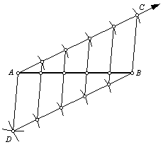 5. Use the straightedge to connect the corresponding points. These line segments will be parallel. They cut line segments AC and DB into congruent segments. Therefore, they must also cut line segment AB into congruent segments. |