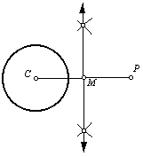 2. Draw line segment CP, and construct point M, the midpoint of line segment CP. (Refer to the perpendicular bisector construction for the construction of the midpoint.) |