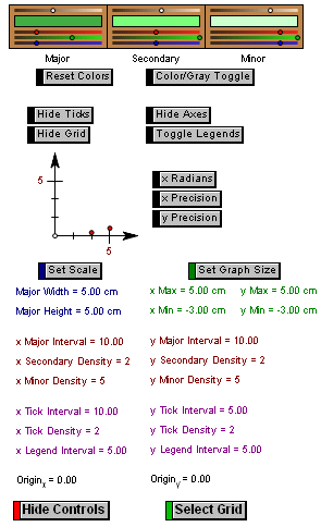 The grid lines are parametrically colored, and controlled by the sliders at the top of the control section. There is a set of sliders for each of the three grids: major, secondary, and minor. Change a color by dragging the corresponding red, green, and blue sliders. If the graph is intended for a grayscale rendering (such as photocopying), press the Color/Gray Toggle button and control the shades with the single grayscale slider above. The Reset Colors button will reset all of the sliders to home positions.