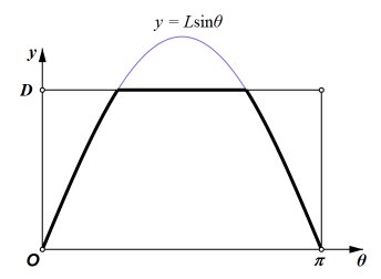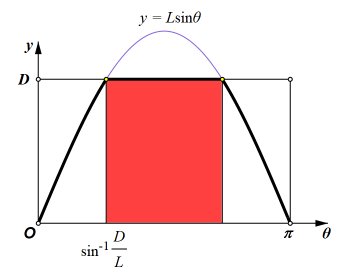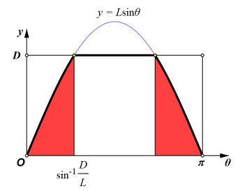 What if D < L?My presentation of Buffons Needle was placed on the web in 1997. Since then, several visitors asked for a derivation of the formula for the case in which D < L. It follows the same line of reasoning as the other case. The outcome of a trial may be modeled with θ-y coordinates of a point. All possible outcomes fall within the rectangle shown here, with 0 < θ ≤ π and 0 < y ≤ D. If the point falls beneath the curve y = Lsinθ, then the outcome is a success. This time, we cannot simply use the area of the region beneath the curve, because, when D < L, not all of the curve is on the rectangles interior. We need the area of the region that is both beneath the curve and within the rectangle. In the second drawing, that region is divided into three parts.