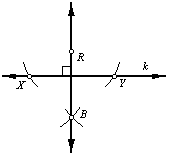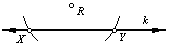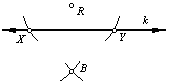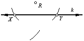 2. Place the compass on point R. Using an arbitrary radius, draw arcs intersecting line k at two points. Label the intersection points X and Y. |
