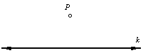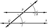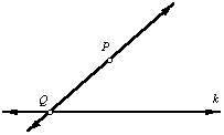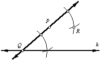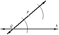 2. Draw an arbitrary line through point P, intersecting line k. Call the intersection point Q. Now the task is to construct an angle with vertex P, congruent to the angle of intersection. |