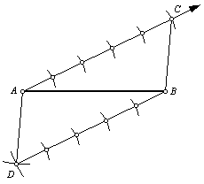 3. Draw an arc with the compass centered at point A, with radius BC. Draw a second arc with the compass centered at point B, with radius AC. Label the intersection point D. Note that ACBD is a parallelogram. |