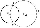 3. Center the compass on point M. Draw a circle through points C and P. It will intersect the other circle at two points, R and S. |